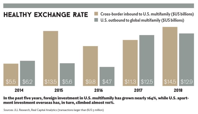 “Even with U.S. investors going overseas, they’re still tremendously active and heavily invested here domestically,” says Maggie Coleman, managing director of capital markets at Chicago-based Jones Lang LaSalle (JLL). “There’s still a tremendously liquid market in U.S. multifamily, with increased investment in 2018, and another active year on tap for 2019. I wouldn’t interpret increased activity by U.S. investors going abroad as signaling any issues with the domestic market.”