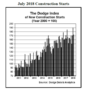 “The pattern of construction starts on a monthly basis is often affected by the presence or absence of very large projects, and several exceptionally large projects boosted activity in June to an unsustainably high amount,” stated Robert A. Murray, chief economist for Dodge Data & Analytics, in a release. “Amidst the monthly ups and downs, the broad trend for construction starts during 2018 remains one of modest expansion.”