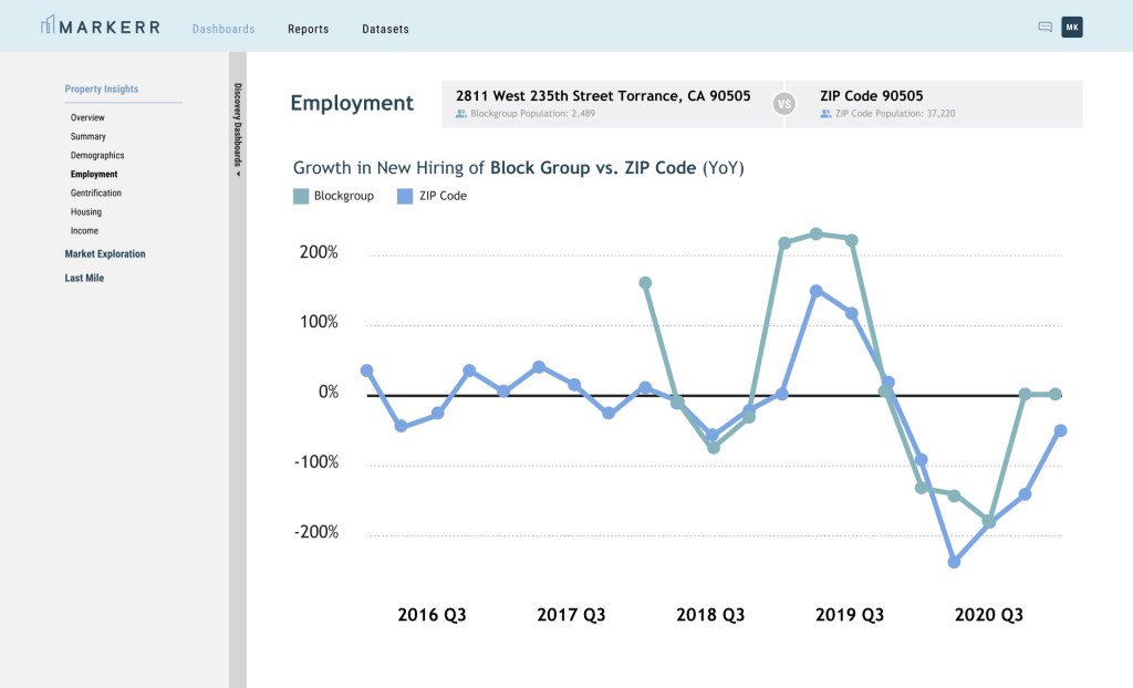 The Markerr system includes dashboards, complete data sets, and research reports for commercial real estate investors, providing information on income, demographics, employment, and hiring statistics down to the block group level—the most precise geographic indicator tracked by the U.S. Census Bureau, smaller than ZIP codes.