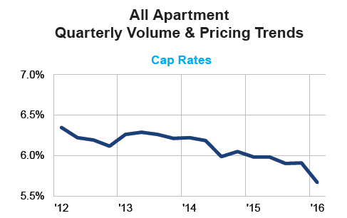 There was 12% growth year-over-year in apartment transaction volume during the first quarter of 2016 on volume of $38.6 billion. The growth was paced by activity in the garden apartment subtype, with volume up 19% year-over-year on sales of $26.7 billion, according to Real Capital Analytics (RCA).