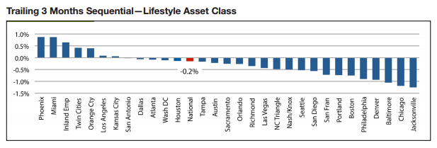 However, with increased supply in the Class A market, 18 of the top 30 metros surveyed experienced negative growth in Lifestyle rents on a trailing three-month basis, compared with a 0.1% growth for markets overall. Markets such as Jacksonville, Fla., Chicago, and Baltimore saw decreases above 1%. The Rent by Necessity market still experienced a 0.2% increase, proving the Class A market might be reaching a ceiling of affordability and causing landlords to start offering concessions.
