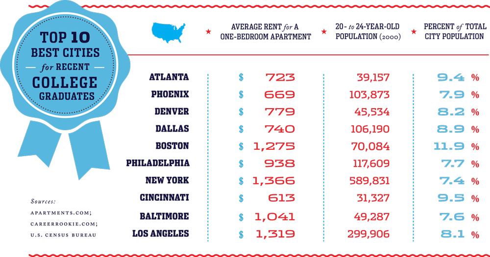 Since many entry-level jobs carry lower salaries, rent affordability is the second-most important consideration. Five cities, including four of the top five, posted average rents well below $1,000 per month for a one-bedroom apartment: Atlanta, Phoenix (No. 2), Denver (No. 3), Dallas (No. 4), and Cincinnati (No. 8). Affordability likely helped Phoenix and Denver rise in the rankings from seventh and eighth place last year, respectively.