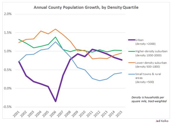 The numbers back up this contrarian play. Exurbs and mature suburbs are growing much faster than city centers, as demonstrated by the incomparable demographer William Frey at the Brookings Institute, in an analysis of Census figures.