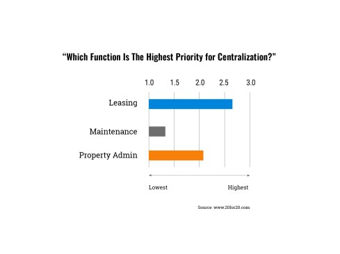 First, the executive priorities regarding centralization—summarized in the chart above—seem clear. Leasing is the highest priority, maintenance is the lowest, and property admin lies somewhere between. It is not surprising that leasing attracts this much focus: Its effectiveness can impact revenue performance significantly. Leasing is also the function that dominates the industry conversation about centralization.