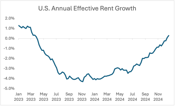 In many respects, 2024 actually outperformed economic projections, and underlying metrics bely the lackluster property performance experienced by much of the multifamily industry. The year even finished with some modest fireworks, as annual effective rent growth turned positive, .3%, at the national level for the first time since early 2023.