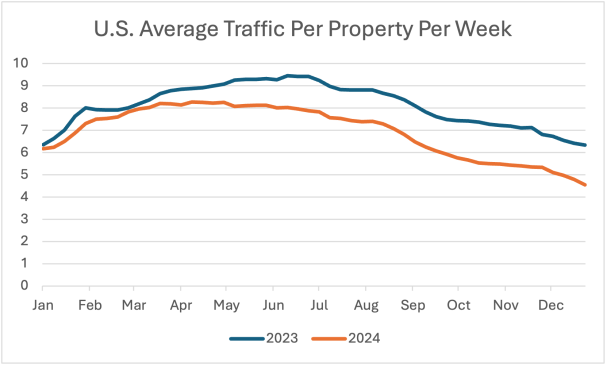 In addition to oversupply, leasing traffic was also slowed in 2024 by an increased emphasis from operators on resident retention. Strong closing ratios kept new lease numbers within sight of norms, but, with more people staying put, the prospect pool was limited. As renewal rates begin to moderate and job growth stabilizes, traffic should see an uptick in the coming months. However, fewer concessions and leasing incentives being offered might offset some of the turnover in the market.