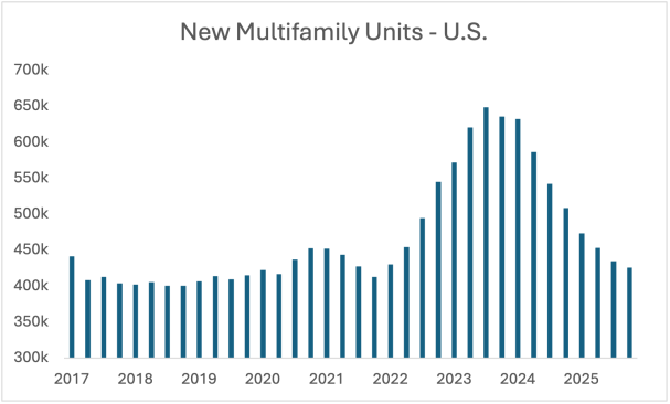 The national labor market was relatively strong, with an unemployment rate in the low 4% range and more than 2 million jobs created over the course of the year, primarily in the health care, government, hospitality, and construction sectors. The private sector will need to pick up the slack in the year ahead to maintain the job growth rate—which directly contributes to household formation and housing demand.