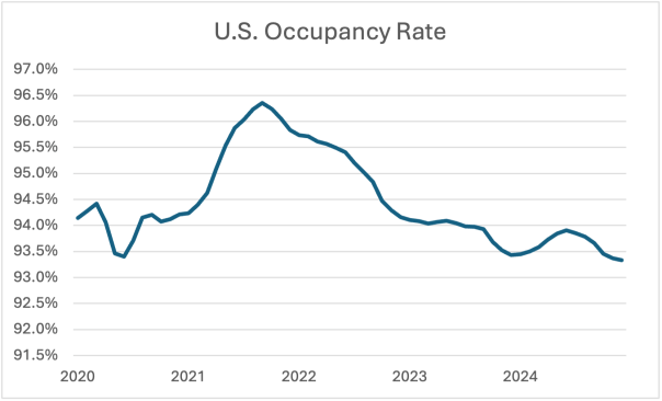 The focus on resident retention benefited operators to a degree, but it didn’t translate to improved occupancy in 2024 due to supply outpacing demand. While overall absorption has been very strong, the U.S. occupancy rate for stabilized properties has not displayed positive year-over-year growth since the middle of 2022. Occupancy rates spent most of 2024 below 94%, but several leading markets were back in the 95% range before seasonality kicked in during fall and early winter. This year, U.S. markets should get back to 94%-plus occupancy and sustain above that level.