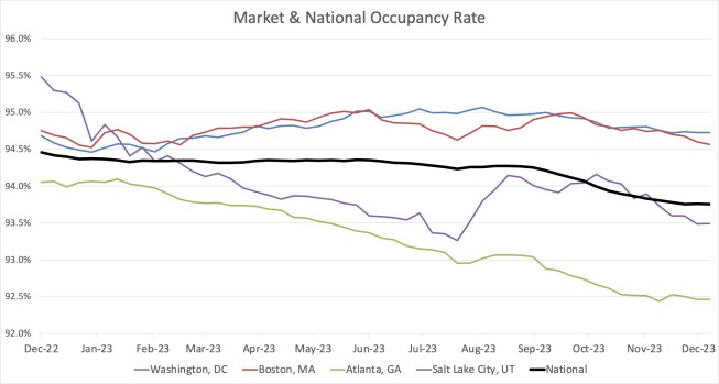 The biggest surprise of the year was the dip in occupancy, beginning in late June when the industry traditionally sees a seasonal occupancy swell. After holding strong at 94.3% for the first six months of 2023, occupancy fell off by 50 to 60 basis points over a period of three months.