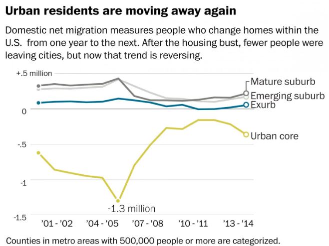 Census figures paint a much more nuanced picture than headlines will allow. The 2014 American Community Survey data show exurbs and suburbs to be growing at a faster pace, while domestic net migration trends show a shrinking “urban core” across all demographics.