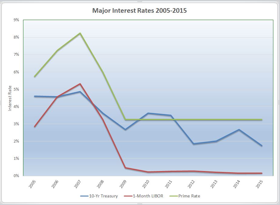 To understand the oncoming wave of loan maturities, one must travel back in time to 2005. The 10-year Treasury rate that year was 4.59%; the one-month LIBOR benchmark, 2.85%; and the prime rate, 5.75%. Investors had just wrapped up their first full year of consistently rising prices and were finally shaking off the lingering shadows of the dot-com bust.