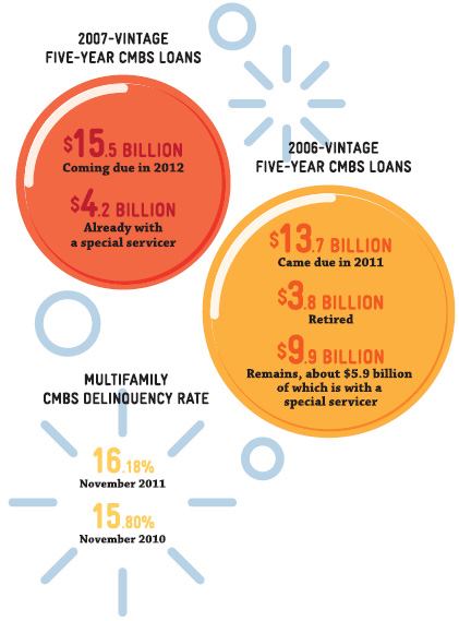 Five years ago, the CMBS industry was on the cusp of a peak year. In 2007, nearly $230 billion in commercial mortgage-backed securities was issued as the commercial real estate markets soared. But the day of reckoning is expected to come this year—a slew of five-year balloon loans made at the height of the market will soon start coming due.In its December report, New York–based CMBS monitoring agency Trepp noted that while many asset classes, including multifamily, saw a drop in 30-day delinquency numbers in November, this amounts to “the calm before the storm.”