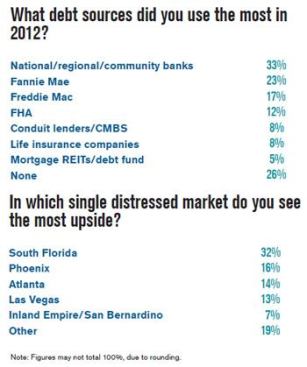 But many companies are charging into 2013 with even more accelerated efforts than this year or last, the survey revealed. And the recovery has been broad: Most respondents say there is no longer such a thing as a distressed market in the multifamily industry. Here are some of the topline results.