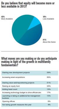 Transaction velocity, also, is poised to accelerate. Thirty-five percent of respondents plan to increase their acquisition efforts in 2013. And after several years of pessimism in the value-add space, the acqrehab market seems to be picking up as well. About 31 percent of those surveyed plan to start new repositioning projects next year.