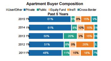 In 2014, cross-border investors accounted for 5% of all apartment transactions. This year, the number has jumped to 9%. “Often, these investors are pursuing partial interests in commercial properties for a variety of operational and tax considerations,” RCA said in the report.