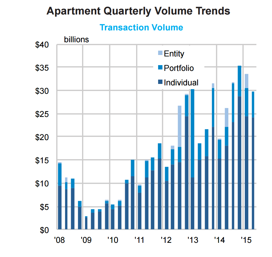 In the first half of 2015, $63.2 billion worth of apartments changed hands, a 37.6% increase compared with last year, according to Real Capital Analytics (RCA). The second quarter produced $29.7 billion worth of this activity, a 13% increase over 2014’s second quarter.