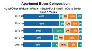 In the mid- and high-rise segment, which tends to attract more professionally managed capital, private investors secured 49% of all transactions. Institutional investors have captured 22% of that deal flow so far in 2015, while cross-border investors garnered 10%.
