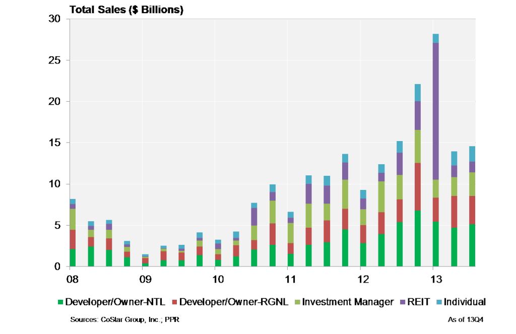 This can certainly be a pause, while REITs ponder whether the momentum in the apartment market will continue. However, it contrasts with the share of purchases by investment managers, which averaged 23 percent between 2010 and 2012 and stayed relatively stable, at 20 percent, in the last three quarters of 2013.