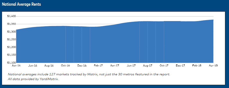 The national average U.S. multifamily rent rose by $4, to $1,377, in April 2018. This marks the second straight month of $4 growth and a $10 increase in the national average over the past two months, following a period of relatively flat rent growth from the summer of 2017 through February 2018.
