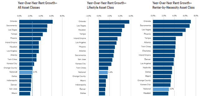 In 11 of Yardi’s top 30 metros, the occupancy rate on stabilized properties dropped by 100 bps or more YOY through March. Of those metros, only Sacramento had rent increases above the 2.4% national average; the average increase in this group is 1.3%.