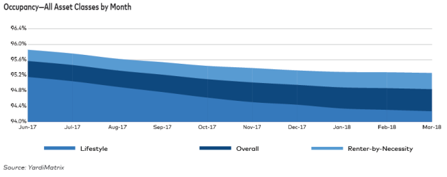 At the national level, the occupancy rate fell by 80 bps, to 94.9% on a national level as of March 2018. (All occupancy data are current as of the previous month.) Seattle, Raleigh, and Nashville, Tenn., all saw 160 bps drops in their occupancy rates through March. Seattle’s YOY rent growth fell to 1.4% from 5.4% one year ago, while Nashville’s declined to 0.8% from 2.6% and Raleigh’s to 0.7% from 3.3%.