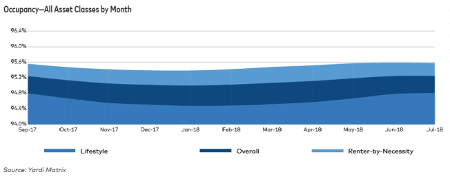 On a trailing three-month (T-3) basis, which compares the past three months of rent growth to the previous three months, rents rose by 0.4% at the national level. Lifestyle and Renter-by-Necessity asset rents both rose by 0.4% on a T-3 basis, reflecting a convergence of rent-growth rates in the short term.