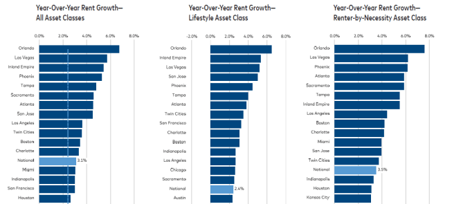 Of the nation’s top 30 metro markets, the top nine for rent growth last month were all located in the South or West regions. Orlando, Fla., led the ranking again, at 6.7% YOY rent growth, followed by Las Vegas, at 5.7%; the Inland Empire (Calif.), at 5.4%; and Phoenix, at 5.3%. Rent growth in Renter-by-Necessity assets continues to outpace Lifestyle-asset growth, 3.5% to 2.4%, as luxury rent growth remains hindered by oversupply.