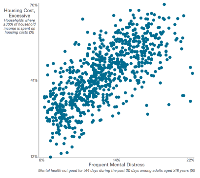 Another comparison across metrics shows that the higher excessive housing costs go, the more mental distress there is among city dwellers. Building Positive + Living Well will focus on the social, community aspect of housing to address mental health, creating a place where people feel welcome and comfortable and can interact with one another easily.