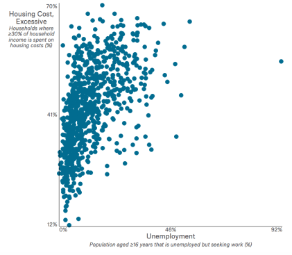 The City Health Dashboard also shows a relationship between excessive housing costs and unemployment: As housing costs in an area go up, so does unemployment.