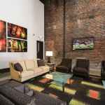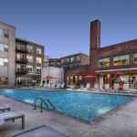 Humphreys & Partners opened part of the space to a large, two-story open area with exposed original brick walls and 40-foot folding glass doors, allowing residents to circulate between the amenity and pool areas located at the center of the development.