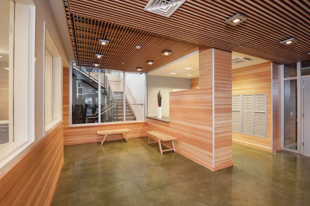 To encourage socializing, the team designated shared spaces throughout the building, among them a light-filled, Douglas fir–paneled lobby (above) with adjacent mailbox area and nearby community lounge. Landscape architect Chris Pattillo of PGA Designs in Oakland designed a small outdoor courtyard above the parking garage, and a two-story glass stairway connects indoor and outdoor areas physically and visually. Residents can garden in the courtyard, which includes a fountain and citrus trees.