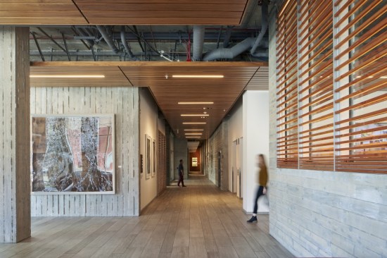 Inside, the ground floor spaces mix natural and industrial tones, including weathered wood paneling, exposed ductwork, and geometric metal accent walls. Over 10,000 feet of original Douglas Fir timber from the Concourse building was milled down for reuse as ceilings, walls, bars, and benches in the common areas.