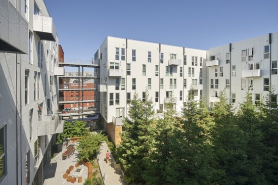 The exteriors feature weathering and galvanized steel cladding, in reference to the area’s industrial history. The 8th and Bluxome side, which opens on a private alley, is clad in random-batten siding with a wavy, “pleated-fabric” silhouette.