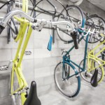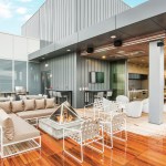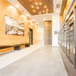 Bora Architects took inspiration for the design from a blue heron that inhabits the park adjacent to the site, using muted gray-blue tones via metal, glass, and concrete and hints of an ochre orange by way of natural wood tones and warm lighting throughout. Wood Partners also wanted to embrace nature’s inspiration with indoor–outdoor elements. At the center of the community, which comprises a 16-story high-rise and five-story low-rise, is a courtyard that’s slightly elevated from the street level. The rooftop lounge also features folding doors that open the closed-in lounge to the outdoors to expand the space.