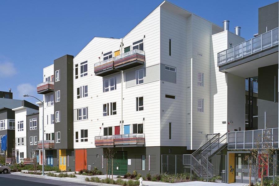 NOT ONLY HAS THE SITE OF A former industrial warehouse in San Francisco returned to life, but its designer and architect have transformed the once-blighted property in an innovative way, with two separate, diverse-looking projects: a for-sale townhouse community for working families and rentals for seniors. Because of the initiative of BRIDGE Housing Corp. , a locally based affordable housing developer, the 3.14-acre site in the city’s Bayview District includes housing for multiple generations with outdoor space, a nearby mass-transit line, and postcard-perfect views of San Francisco Bay and Twin Peaks.