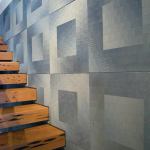 One shear-wall defines part of the family room, featuring a set of wood steps attached only to the wall, causing no small amount of headache for the builder. The free-standing steps had no other method of support. Behind the steps, patterned panels change in appearance as the angle of lighting changes, or by your location of viewing. This wall captures your attention when you enter the family room.
