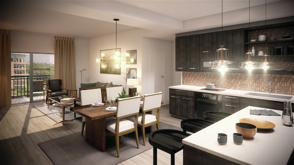 What Gables says sets the community apart is its luxury hotel-like amenities. There will be a full-service concierge on-site who is a full-time employee to assist residents. The building features a rooftop pool, spa, and cabanas; an outdoor kitchen and courtyard with fire pits; a gourmet demonstration kitchen; a resident lounge; a customizable media theater; a yoga studio; dog walking services; a coffee bar; and a courtyard putting green.