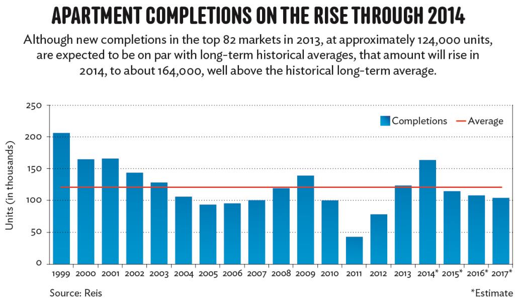 Yet, forecasts show that the tide is going to turn, sooner rather than later, and this will require a change in behavior on the part of investors for the next few years. In fact, construction is going to increase not only relative to recent history, but also relative to longer historical trends. New completions in the top 82 markets for 2013 are expected to total roughly 124,000 units. This is on par with the long-term historical average of roughly 120,000 units per year. However, for 2014, new completions are expected to total about 164,000 units, well above the historical long-term average.