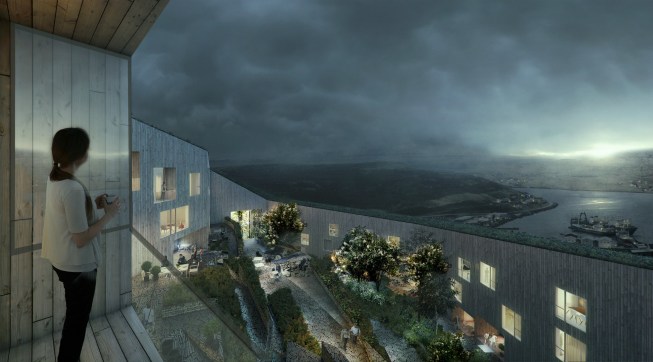The Scandinavian architecture firm won the “Vertical Challenge” category of the Nordic Built Cities competition, which called for a family housing development on Runavik. The island is one of 18 that lies between Iceland, Scotland, and Norway in the North Atlantic Ocean and is known for its steep terrains, strong winds, and geothermal heat.