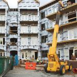 Directly across a narrow street from the building sit rows of leased-up apartments atop an abundance of retail shops and restaurants. They seem close enough to touch. Cranes, bulldozers, and other heavy lifters navigate the closed road with precision as they move to different sections of the structure. The road can only remain closed for a few hours each morning to minimize the disruption to the current residents. So the morning is a race to get all the supplies in.
