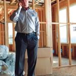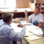 Time to return to the business trailer for the weekly owners meeting. Born, Graham, senior project architect Dwight Bailey of Phillips Partnership architectural firm, and development manager Ray Crocker from developer Branch Properties sit down to resolve several budget and scheduling issues. The men unravel long scrolls of building plans and pore over what has been changed and what needs to be done.