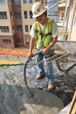 Toward the middle of the building lies Zone 2, where teams of workers snake a long hose through the dark hallway out to the unfinished balcony. Thick liquid concrete oozes out to form the floor. Like the other subs, the concrete workers move down the line from Zone 1 to Zone 3. Each time they do, the next team of contractors comes in right behind them to keep a fluid workflow.