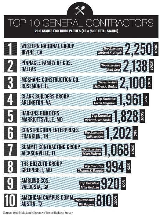 In the multifamily business, if you’re a third-party apartment builder, you generally make that your bread and butter. More than half of the companies on Multifamily Executive’s Top 10 General Contractors list solely did third-party starts in 2010. One company did 92 percent of its starts for third-party customers. And everyone on the list started more than 68 percent of their units for third-party clients.