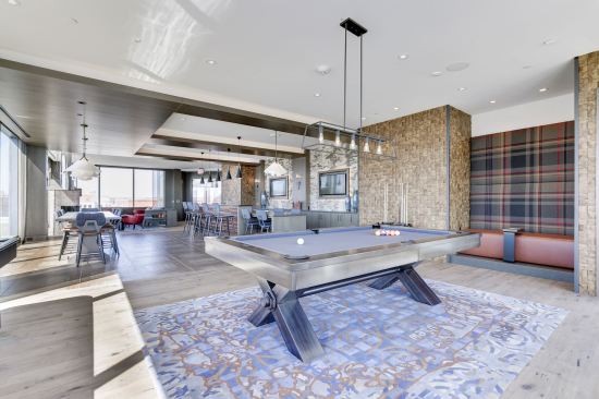 A rooftop deck is available to all residents and features a fire pit, grills, two swimming pools connected by a waterfall, and panoramic views of the city. Interior community amenities include a 24-hour fitness center, a pet spa, a club lounge with TVs, a pool table, and table shuffleboard.