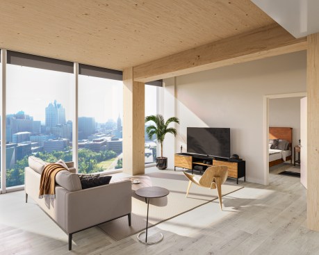 At 25 stories, Ascent in Milwaukee is touted as the world’s tallest timber structure. Although the sustainability of mass-timber construction is a big differentiator for the project, so is the design side of it. “The DNA of our company is in building — understanding the way buildings work and how to improve them based on the way spaces are actually used,” says Jodi Hogerton, marketing manager for Ascent’s developer, New Land Enterprises.