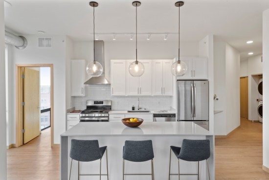 But the pinnacle of common-space design takes shape on the 25th floor, complete with a dramatic glass-wrapped lounge and two bars that double as community kitchens. “On the weekends, one of those bars is actually staffed,” she says. “We run Milwaukee’s first food hall, Crossroads Collective, so we have a lot of hospitality services at our disposal. It’s been exciting. A lot of our potential residents say, ‘Ooh, it’s like living at a hotel!’”