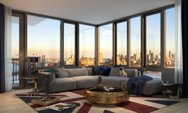 The 23-story tower’s 120 units range from studios to two-bedroom apartments, many offering terraces or balconies and views of downtown Manhattan, the Brooklyn Bridge, and the Hudson River. Downstairs, the building contains 6,000 square feet of ground-level retail space and 20-foot ceilings throughout, as well as an all-glass façade. Current rents average approximately $4,600.