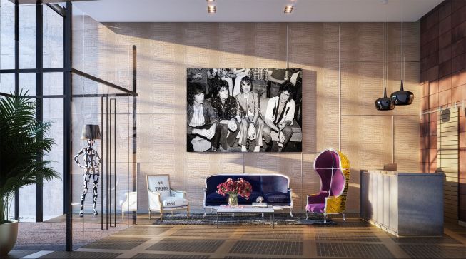 The building’s common spaces are fitted with Exhibit’s curated art and photograph collections. A 250-foot-high private penthouse club contains a private dining room, demonstration kitchen, and wraparound adjoining terrace.