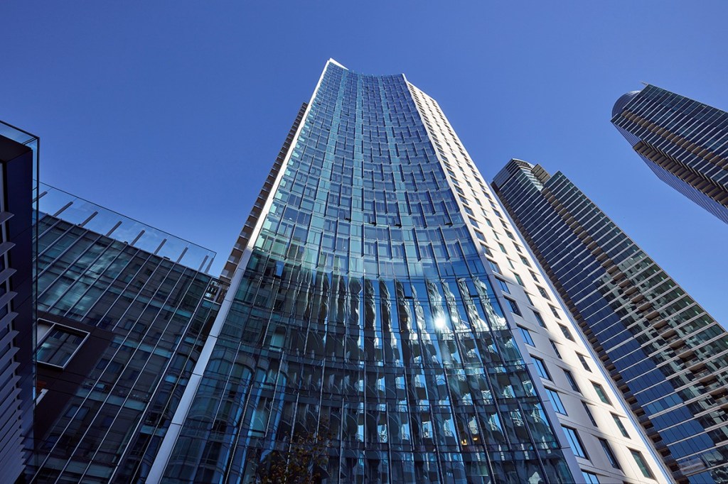In addition to dramatic water and skyline views, the building’s ninth-floor amenity deck has a club lounge with demonstration kitchen, a fitness center open 24/7, and an outdoor yoga studio. There’s also an outdoor grilling area, bike storage, rental electric-vehicle stations, and a 24-hour concierge for residents. Many of the apartments have private patios and terraces, with large floor-to-ceiling windows, hardwood flooring, and open-concept living spaces.