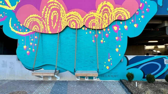 Beyond the surface of the clouds, Palmisano collected handwritten wishes from the neighborhood and integrated these aspirations—such as healthy children, world peace, and an end to racism—into her colorful custom-fabricated metal clouds. Two swings in front of the wish-filled clouds also provide a photo opportunity.